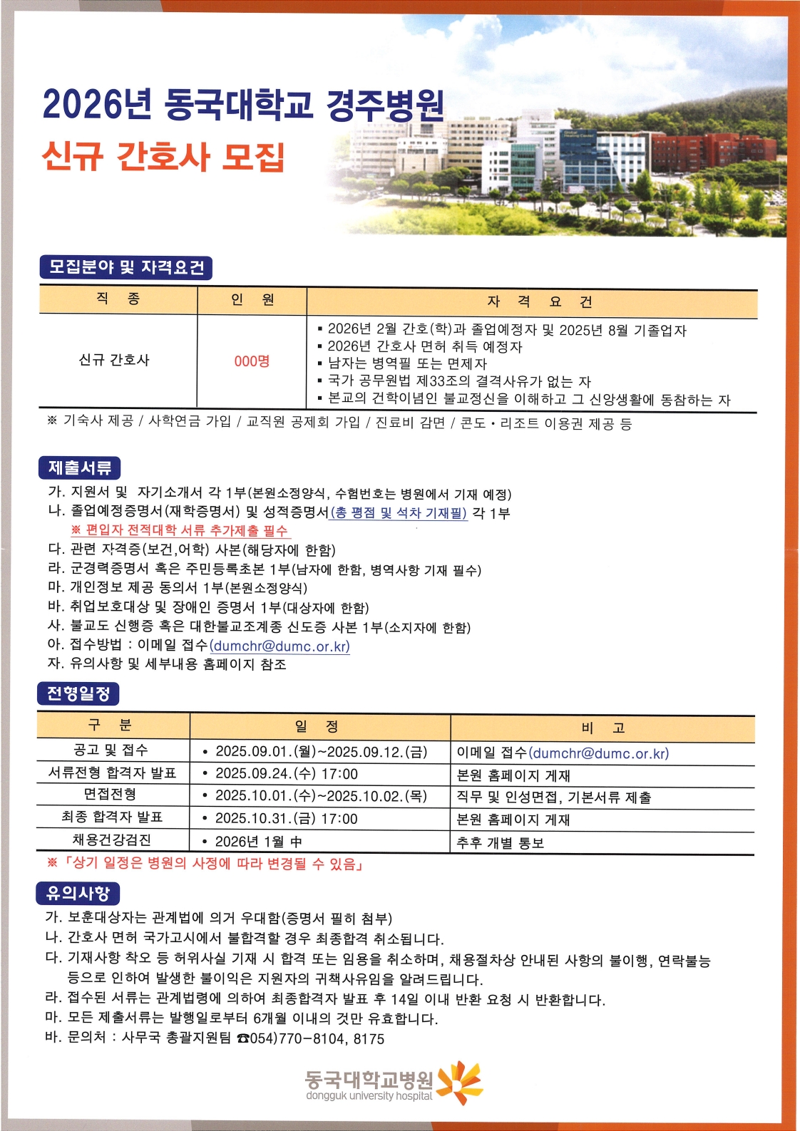 2026년도 동국대학교 경주병원 신규간호사 모집